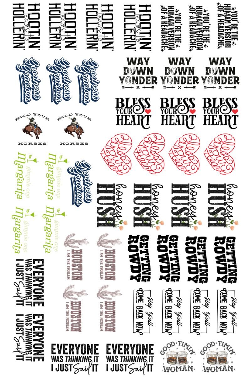 - Quantity of Designs on Gang Sheet Varies Depending on Size and Shape of Each Design