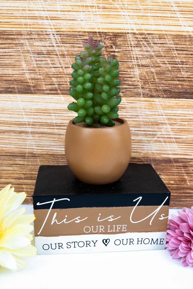 This charming book-like tabletop piece with artificial succulent is a great way to add the look of greenery to your home or office without the maintenance!