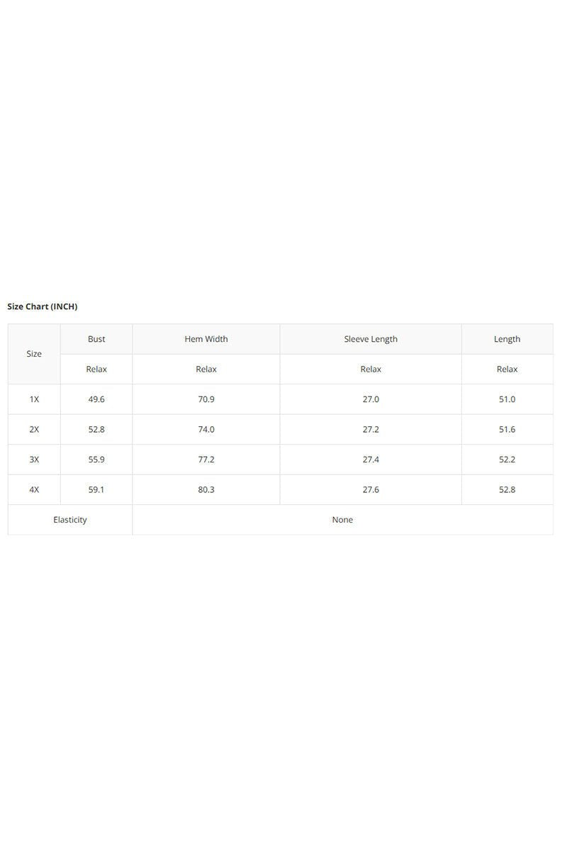 - Approx. Manufacturer's Measurements for 1X: Bust: 49.6" x Hem Width: 70.9" x Sleeve Length: 27.0" x Length: 51.0"