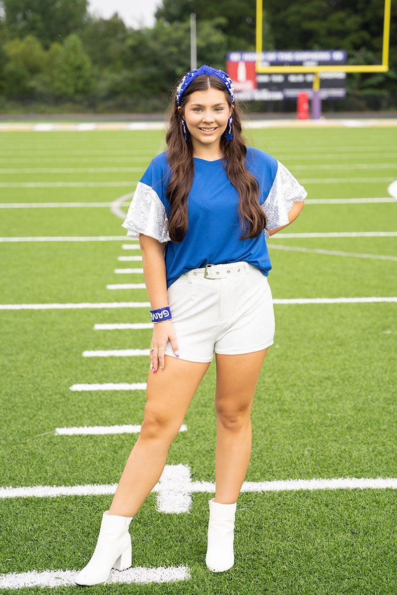 Take your style game up a notch with these sleek crystal belted shorts! Whether you're rocking them at your next party or supporting your team at the next football game day, you'll sparkle and shine in these showstopping shorts!