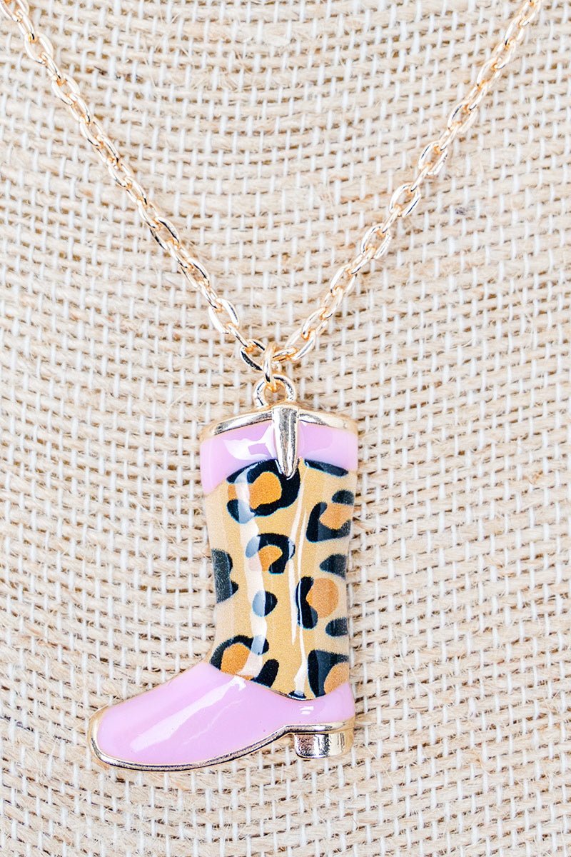 Shiny Luxe Pink Lola Leopard Boots Goldtone Necklace