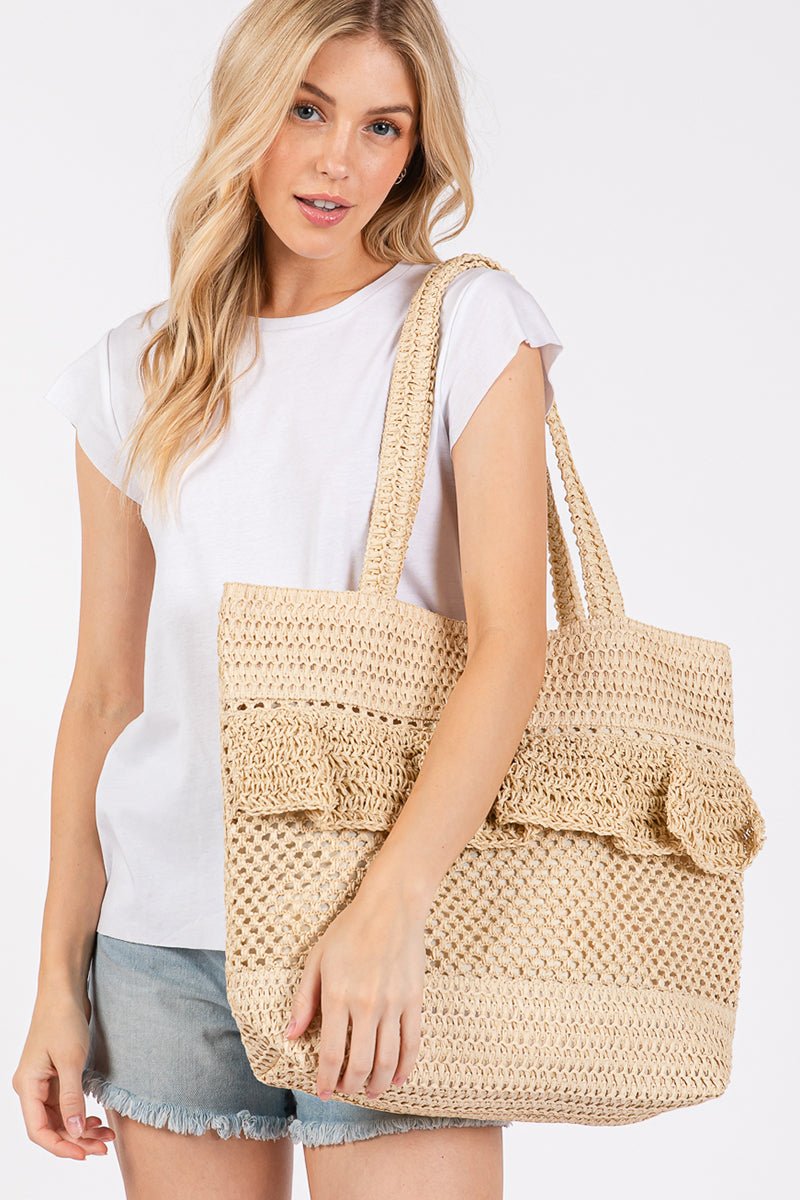 Sunny Getaway Beige Ruffle Crochet Straw Tote Bag